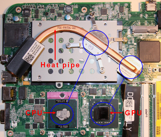 wir uns nun die Heatpipe an: Auf dem Wärmeleitweg liegt die GPU hinter dem